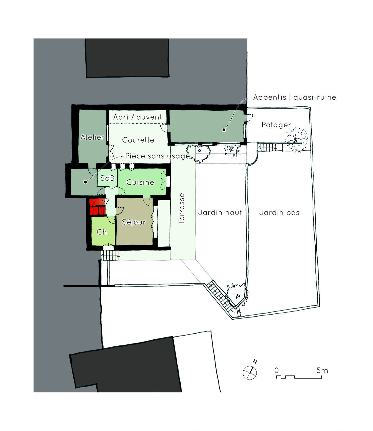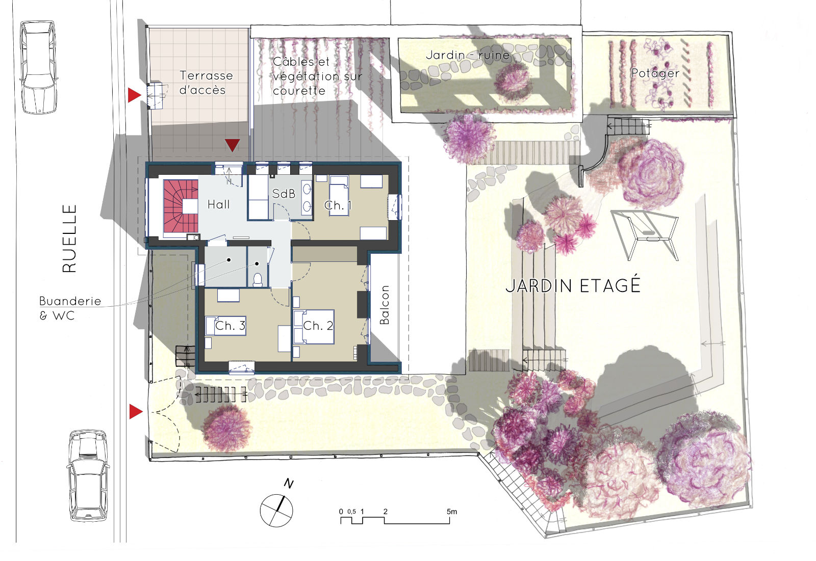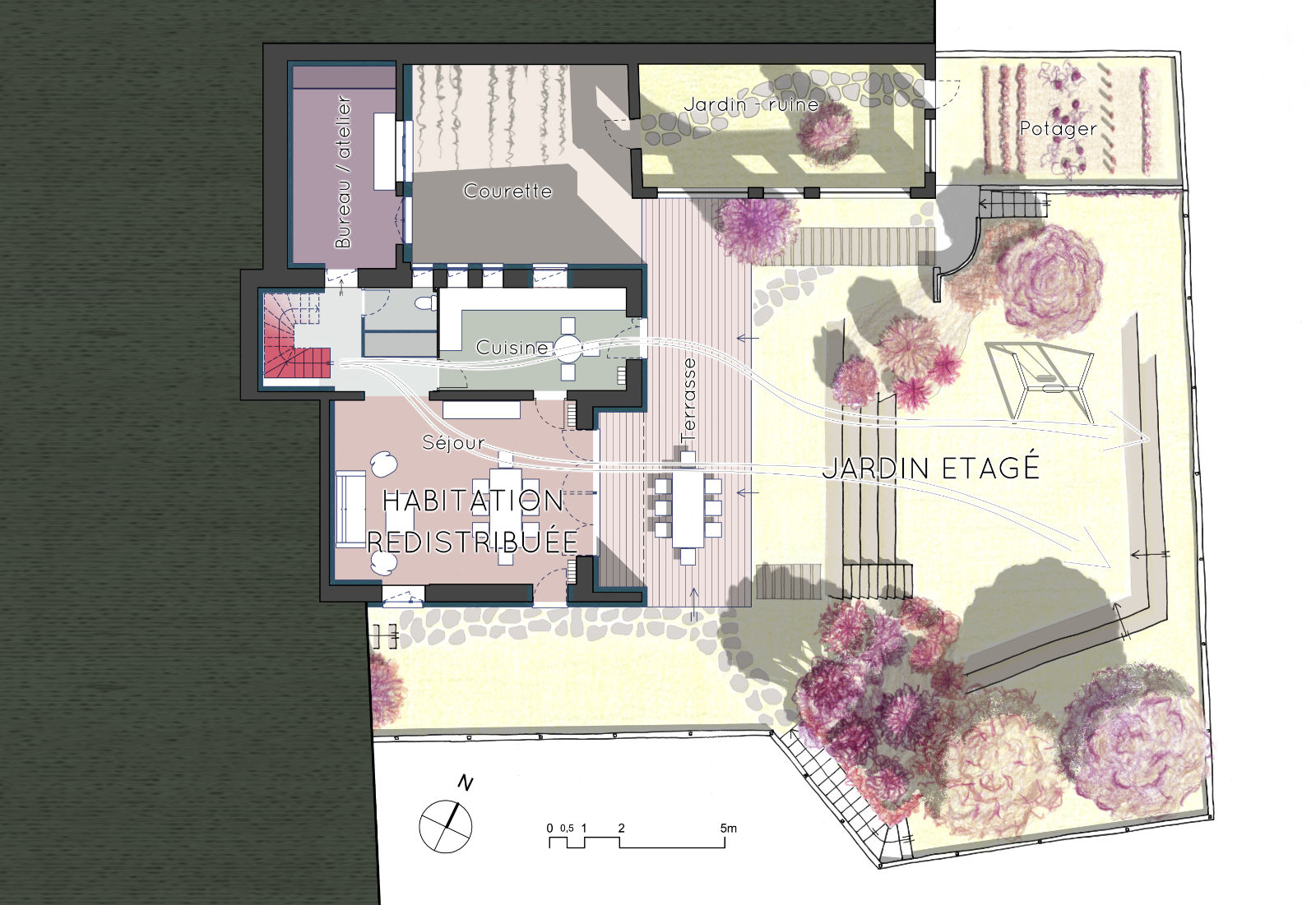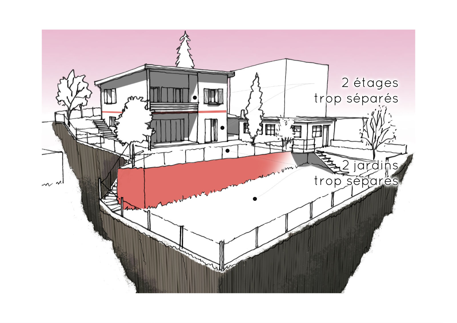 / Projet : rénovation et reconfiguration complète de la maison – rénovation énergétique – réunion des deux jardins en un unique étagé par des gradins – étude paysagère pour une meilleure définition des usages du jardin