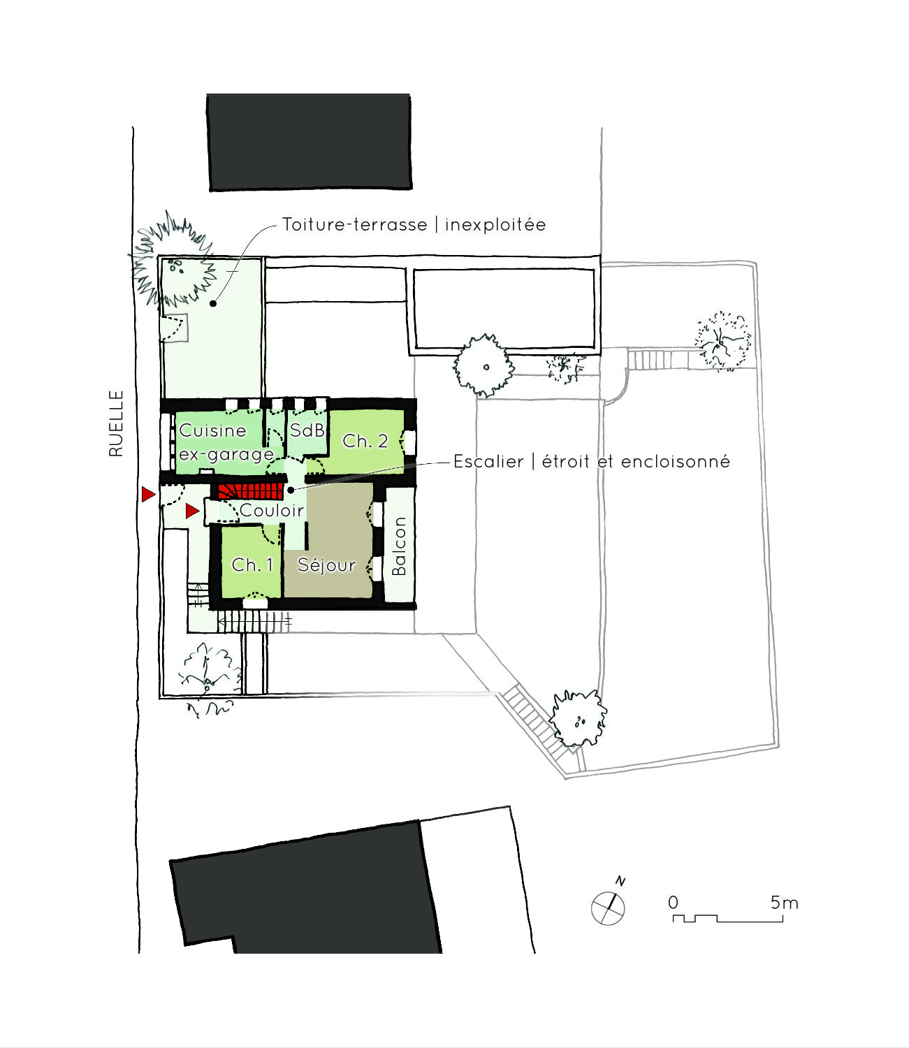A l’origine, une maison et son jardin qui souffrent tous les deux du même défaut : être coupés en deux étages trop peu communicants entre eux. Le projet : réunir l’ensemble en un seul et même lieu d’habitat, du haut contre la rue jusqu’en bas du jardin, pour une vie dans des lieux plus fluides et adaptés à une famille.